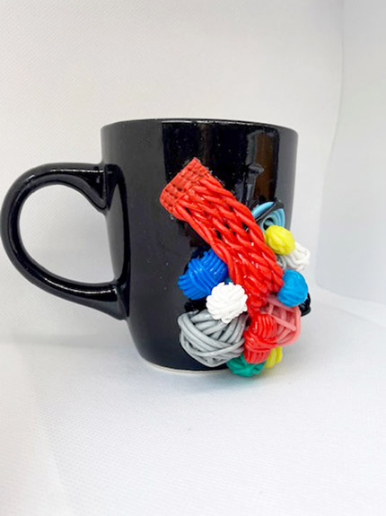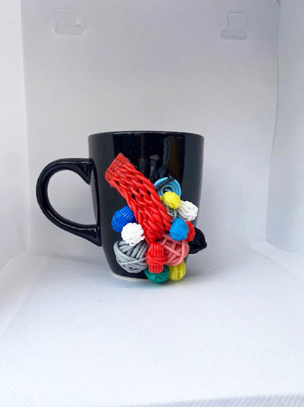Black mug designed in colourful knit kit, 325ml, hand-made and hand-washable.